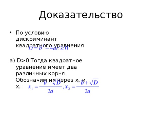 0.Тогда квадратное уравнение имеет два различных корня. Обозначим их через х 1 и х 2 : " width="640"