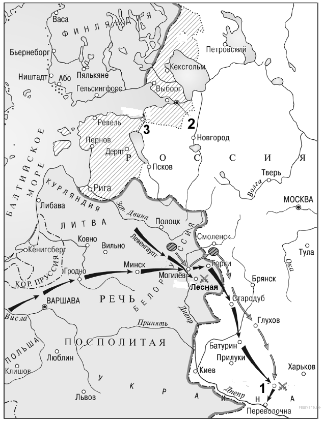 3) В сражении под городом, обозначенном на схеме цифрой «1», русское войско потерпело сокрушительное поражение.