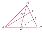 | Проведение параллельной прямой до пересечения со стороной в точке. Дополнительное построение позволяет использовать подобные треугольники ∆AKM и ∆ALD. |