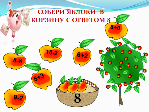 Читают примеры, отправляют в корзину яблочки с ответом 8.