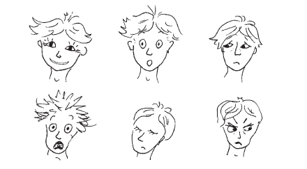 Учащимся демонстрируется разнообразный иллюстративный материал, изображающий людей, выражающих определенные эмоции. На первом этапе целесообразно использовать картинки или фотографии, содержащие четко прослеживаемую мимику, характерную для определенных эмоций. Кроме того, участникам можно предложить в качестве домашнего задания самостоятельно подобрать и принести на занятие портреты и фотографии, которые помогают увидеть яркие выражения эмоций. Педагог-психолог демонстрирует иллюстративные материалы всем учащимся сразу. Учащиеся выдвигают гипотезы о том, какие эмоции отражены на этих картинках и в каких именно деталях мимики они выражаются.
