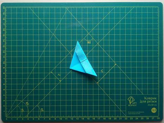 Расположим большой синий модуль длинной стороной вправо и двойными уголками вниз (это голова). Затем вложим 2 больших синих модуля двойными концами во внутренние карманы головы.