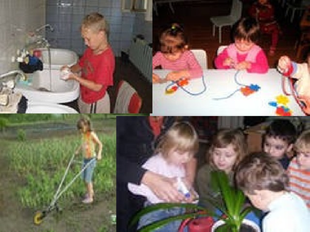 Ответ. Виды труда: - самообслуживание (ложка, пуговица, мячик), - хозяйственно –бытовой (пылесос), - труд в природе (полив цветов).