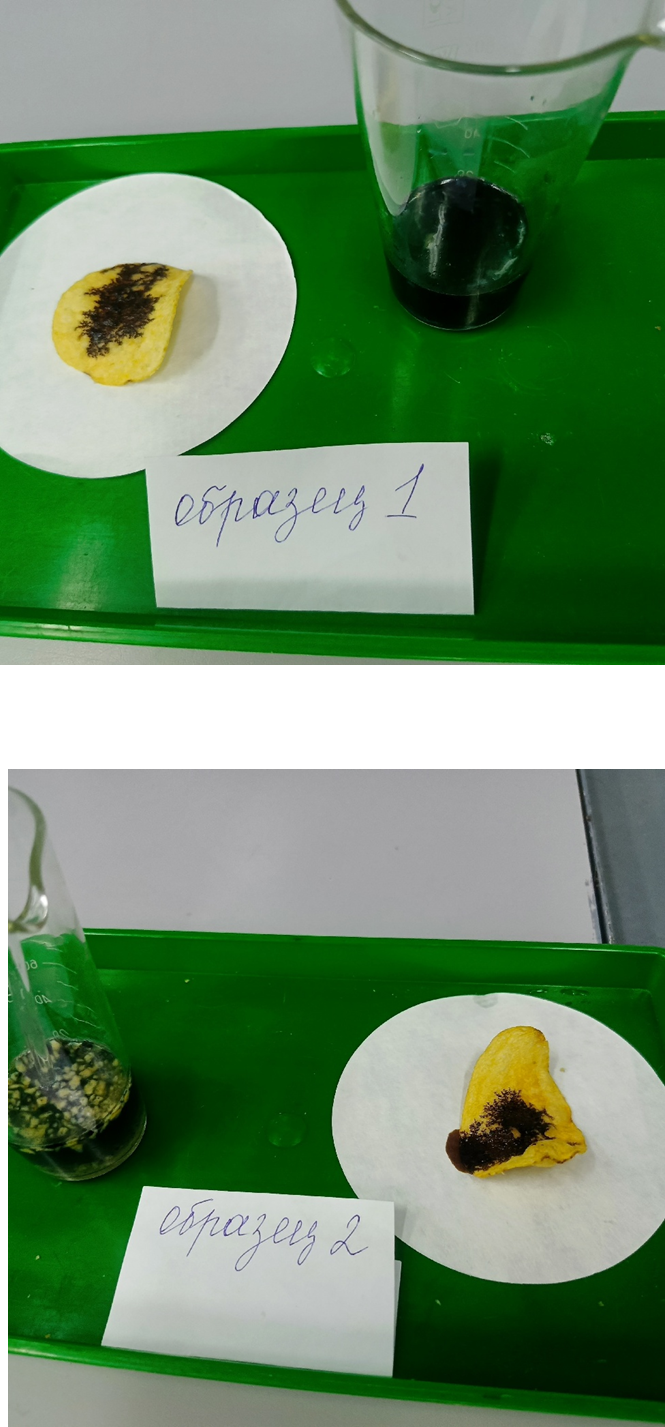 Вывод. Проведённый эксперимент наглядно подтвердил наличие значительного количества крахмала во всех исследованных образцах картофельных чипсов. Моментальное и интенсивное сине-фиолетовое окрашивание йодо-крахмального комплекса свидетельствует о том, что крахмал является основным углеводным компонентом продукта. Данный результат полностью согласуется с теоретическими данными, поскольку картофель и его производные служат богатым источником этого полисахарида. Высокое содержание крахмала, особенно подвергшегося высокотемпературной обработке, объясняет, почему чипсы, обладая высокой калорийностью, обеспечивают лишь кратковременное чувство сытости, являясь источником так называемых «пустых калорий». Этот факт является важным аргументом в пользу ограничения потребления подобных снеков в рационе подростков.