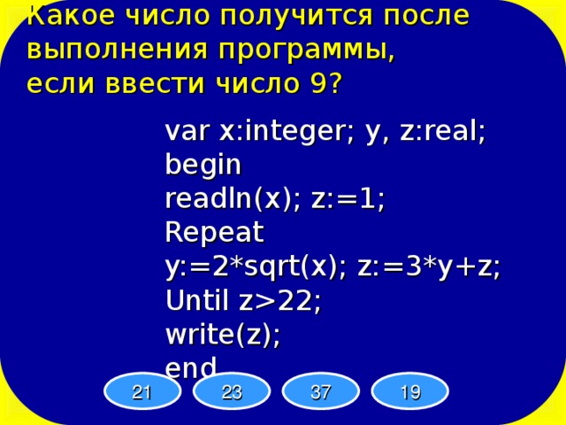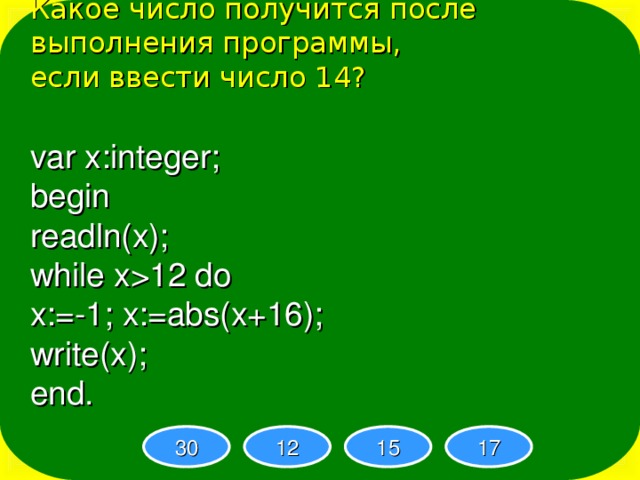 12 do x:=-1; x:=abs(x+16); write(x); end. 30 12 15 17 " width="640"