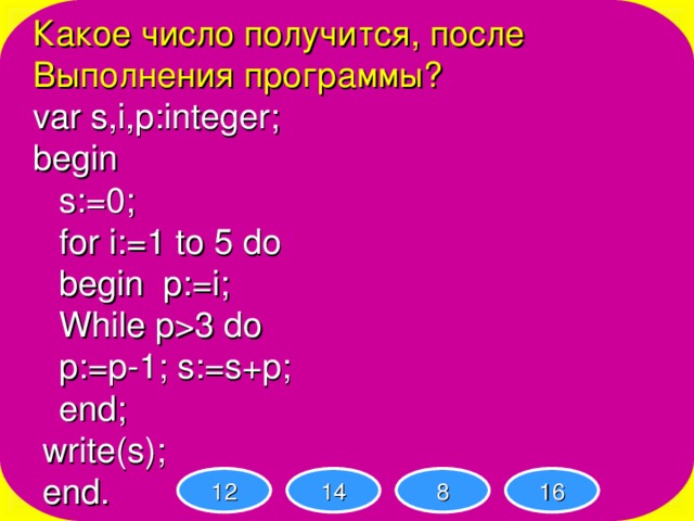 3 do p:=p-1; s:=s+p; end; write(s); end. 12 14 8 16 " width="640"