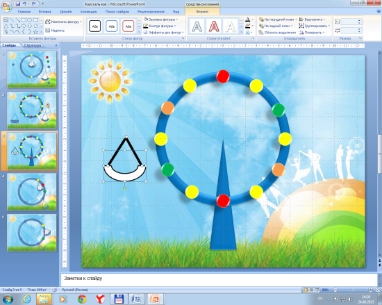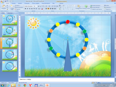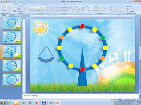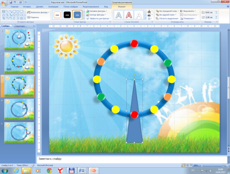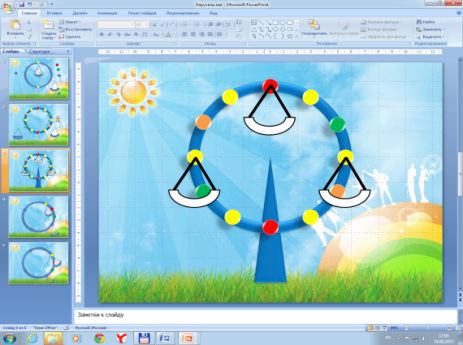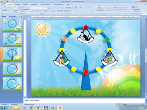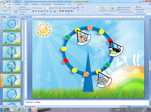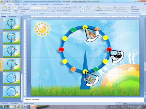 Каждый раз, получив копию последнего созданного слайда, снова поворачивайте кольцо и изменяйте положение качелей.