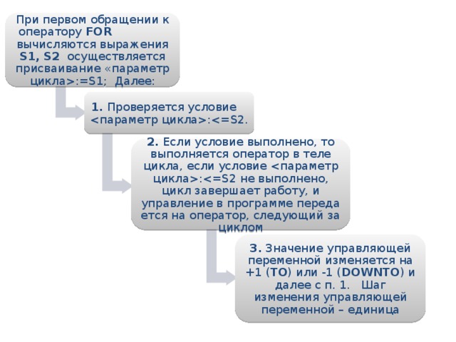 При первом обращении к оператору FOR вычисляются выражения S1, S2 осуществляется присваивание «параметр цикла:=S1; Далее: