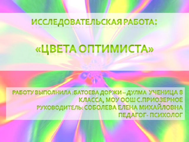1.Изучить теоретическую основу вопроса. 2.Изучить приоритетный цвет у людей (5 - 9 классов - 15 человек). 3.Изучить стиль мышления - тест « Оптимист или пессимист » .