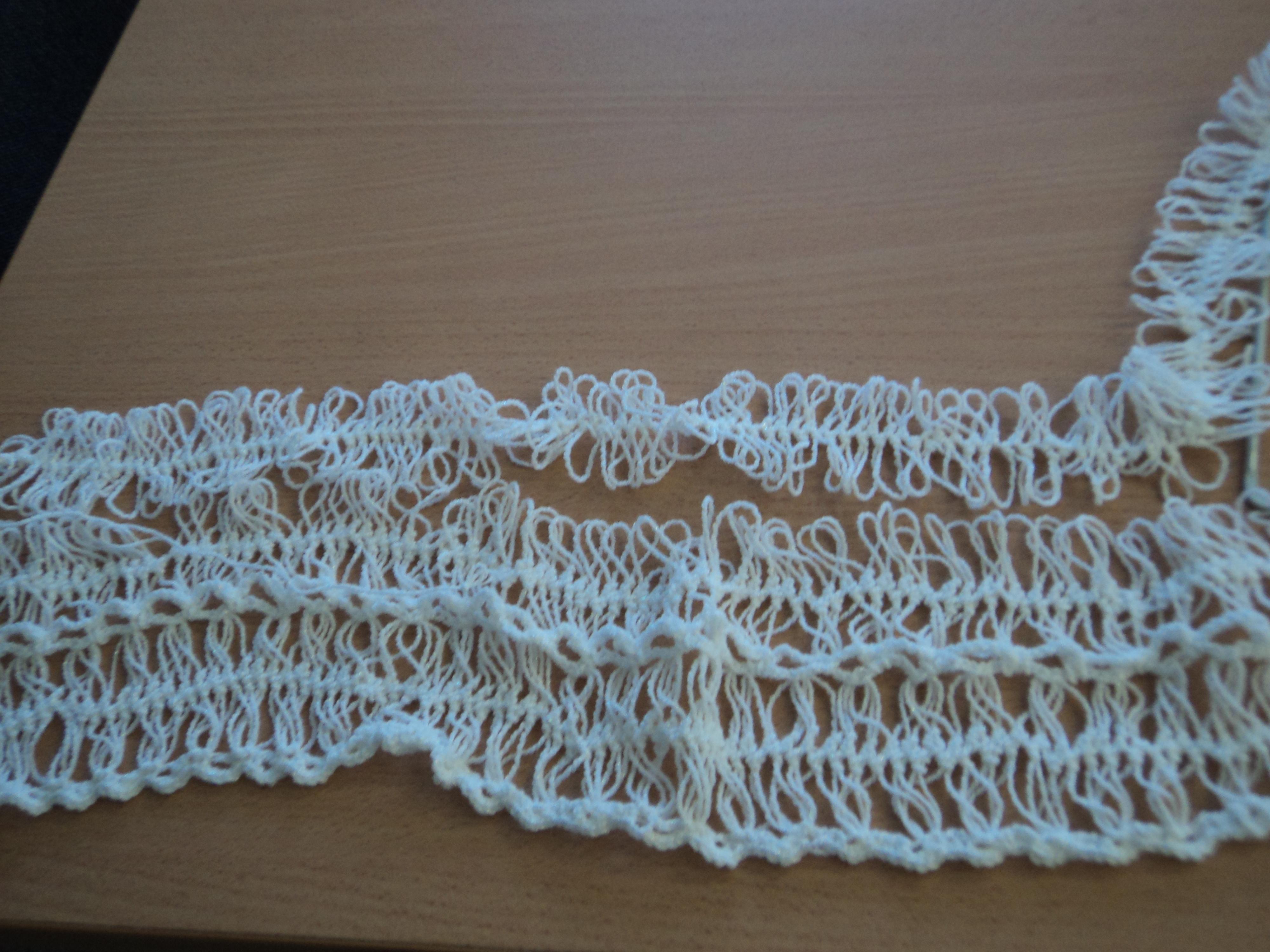 Это моя вторая большая работа, выполненная в технике вязания на вилке. Первый шарф я связала пряжей красного цвета. Это был первый опыт, и, естественно, были ошибки: соединение нитей во время вывязывания полос нарушали ровность ажурной ленты, затем пропуск петли при соединении полос. Ошибки небольшие, но на устранение их требуется много времени, следы исправлений всё равно видно. Кроме того, я поняла, что для получения ажурной работы нужно взять вилку с большим расстоянием между направляющими, например, 6 см минимум.