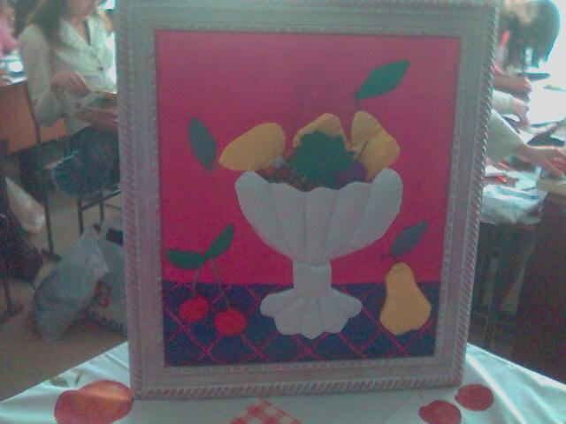 Так как я являюсь победительницей городской олимпиады по технологии, получила приглашение на краевую олимпиаду. Мне надо разработать и изготовить комплект изделий для сервировки стола. У меня возник вопрос: «Какие изделия изготовить?» Перелистав множество журналов и книг, посоветовавшись с мамой и учителем, я остановила свой выбор на скатерти и салфетках (См. фото 1). Мне всегда хотелось украсить интерьер кухни каким-то изделием, которое бы я изготовила сама. Как-то по телевизору смотрела передачу о традициях чаепития на Руси и увидела очень красивую вещь: грелку на чайник в виде ягоды – малины. Идея изготовления такой грелки показалась мне очень заманчивой, и я решила сделать это самостоятельно. Картина с аппетитным сюжетом украсит интерьер кухни.