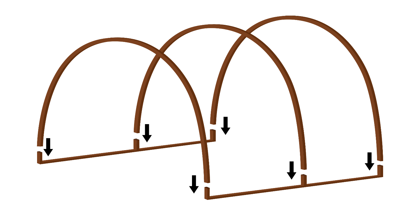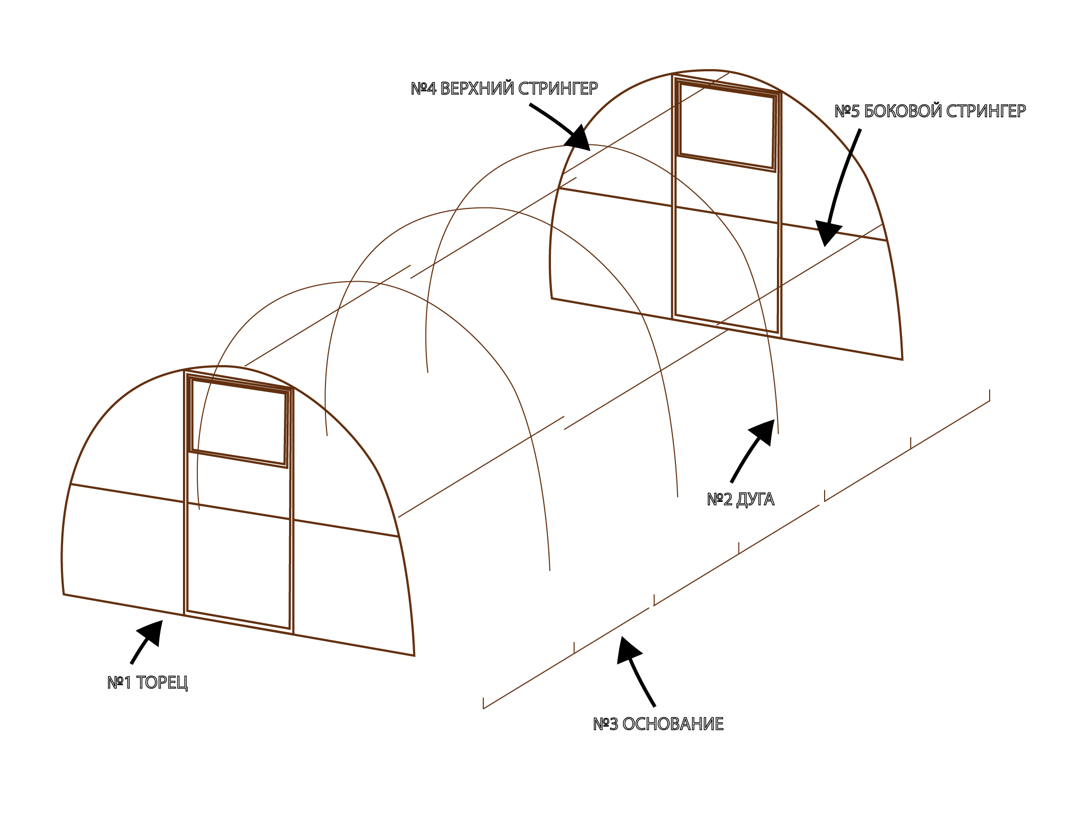 Установить дуги (рис. 2) на направляющие(основание). Дуги и торцы соединить продольными стяжками (стрингерами, рис 3) и прикрепить к каждой дуге с внутренней стороны и торцам с помощью винтов и гаек с шайбами и затянуть их при помощи ключа и отвертки. Важно чтобы после затяжки винтов их головка была утоплена в трубу и не выступала над её поверхностью более чем на 1-1,5мм.