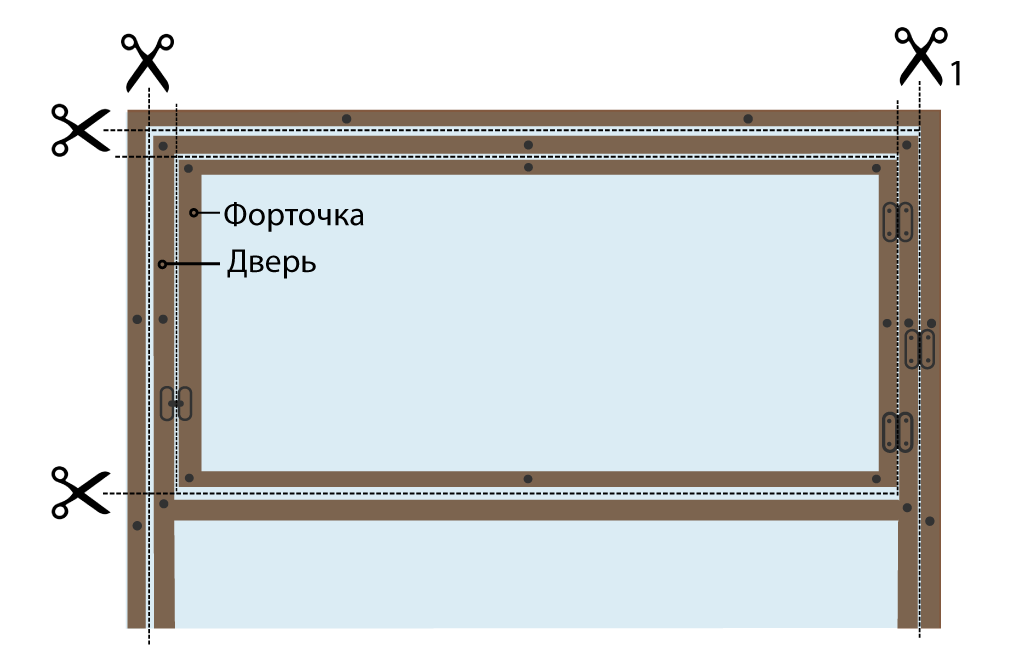 После закрепления поликарбоната приступаем к вырезке по стойке с петлями двери и форточки. При помощи ножа и линейки прорезаем сотовый поликарбонат по вертикальной линии открывания двери и форточки. Для лучшего открывания необходимо вырезать выступы шарниров двери и форточки, а также удалить разрезанную часть соты поликарбоната. Горизонтальный разрез следует делать посередине между рамками форточки и рамки двери.