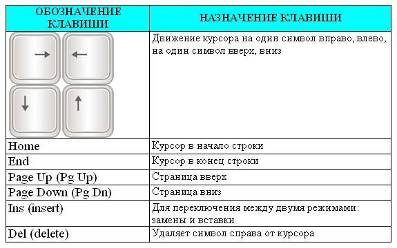 Для перемещения курсора служат клавиши управления курсором, на них изображены стрелки, направленные вверх, вниз, влево и вправо. Эти клавиши перемещают курсор на одну позицию в соответствующем направлении. Клавиши PageUp и PageDown позволяют «листать» документ вверх и вниз, а клавиши Home и End переводят курсор в начало и конец строки.
