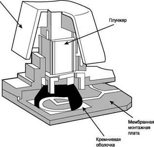 Третий тип – мембранные (пленочные), наиболее дешевый и распространённый. При нажатии на клавишу замыкаются две мембраны. Обычно мембраны для всех клавиш напаиваются на одну пленку и разделяются промежуточной пленкой с отверстиями. Получившаяся мембрана помещается под клавишами: при нажатии мембраны замыкаются, при отжатии – размыкаются, а клавиша возвращается назад при помощи резинового купола. Такие клавиатуры очень технологичны и дешевые, но не долговечные. К плюсам мембранных клавиатур можно отнести тихую работу, «мягкость» (легкость нажатия на клавиши), упомянутую выше защищенность от внешних воздействий и низкую (от 150 руб.) цену.