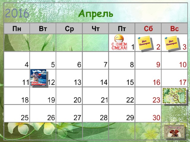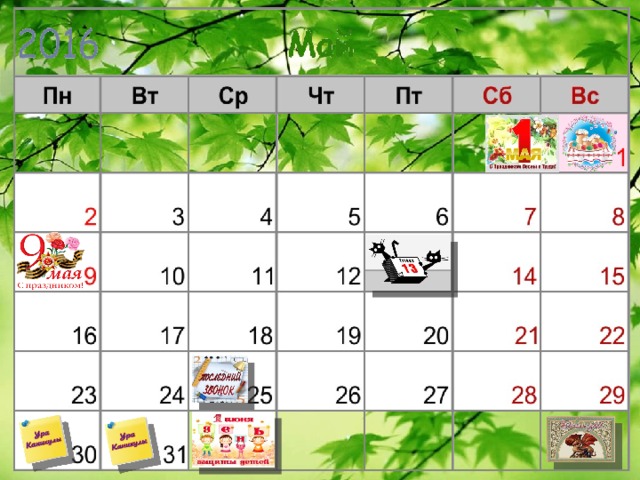 В конце презентации есть слайды с клипартами – напоминалками. Можно копировать картинки и вставлять их в календарь, обозначая события месяца или добавлять свои.