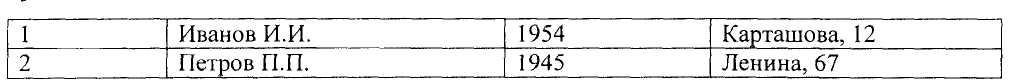 Примером табличной базы данных может служить следующая таблица:![]()