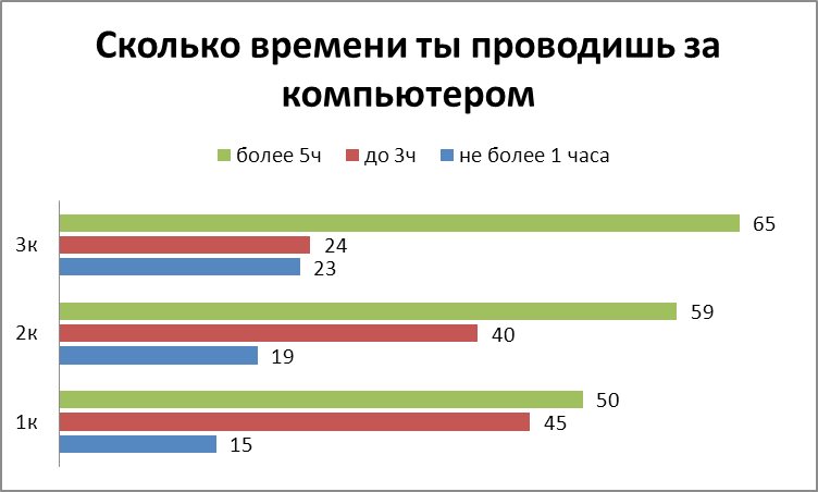 за компьютером. Оказалось, что учащиеся отдают предпочтение «общению» с компьютером, нежели общению с друзьями или другим видам досуговой деятельности.