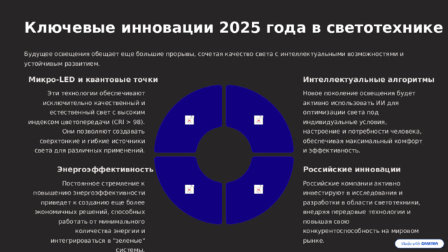- Энергоэффективность и комфорт: Современные технологии делают свет доступным, адаптируемым и максимально комфортным, при этом минимизируя воздействие на окружающую среду.