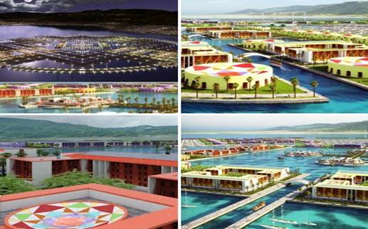 Одним из инновационных проектов является проект города на воде, защищенного от землетрясений, который создали в дизайнерском бюро Танграм 3ДС после сокрушительных землетрясений в Чили и на Гаити (рисунок 10). Этому городу не страшны такие стихийные бедствия, при этом он защищен волнорезами от океанских волн и на его территории может произрастать достаточное для обеспечения жителей количество пищи.