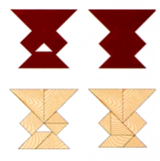 Парадокс танграма заключается в следующем: каждый раз полностью используя весь набор, можно сложить две противоречивые фигуры, одна из которых будет подмножеством другой.