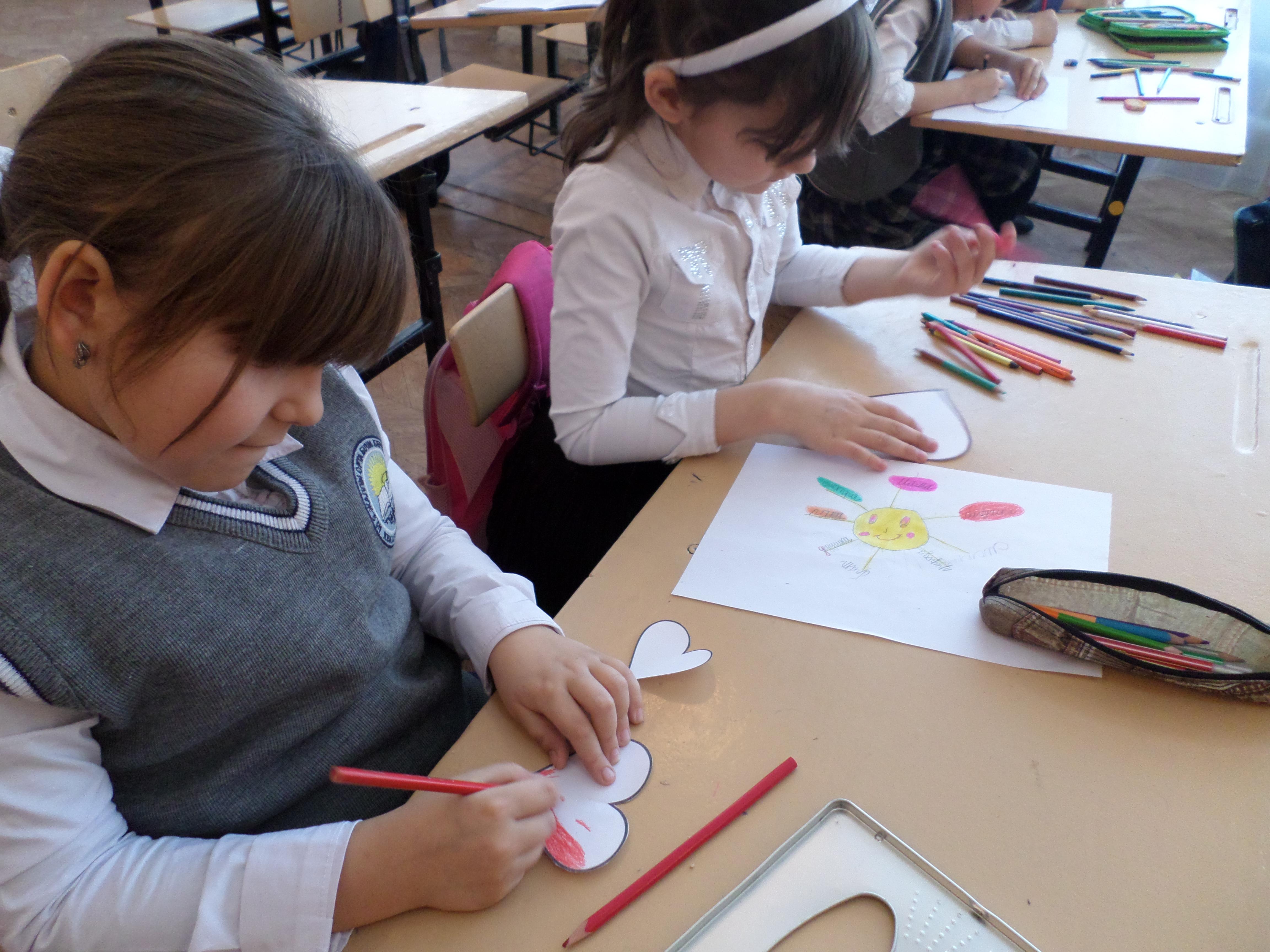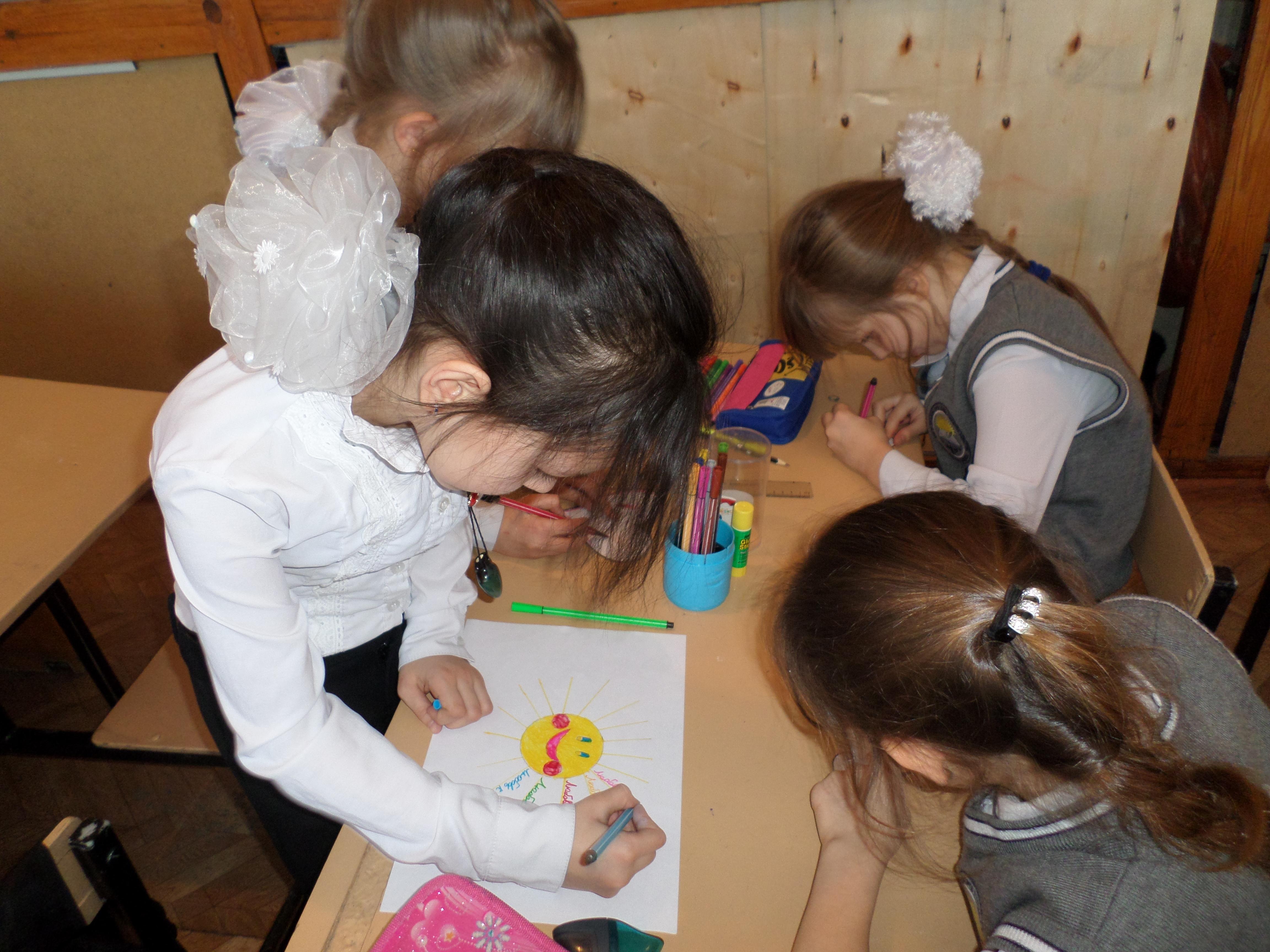 | Ход урока 1. Организационный момент. Позитивный настрой. Концентрация на Свете. Учитель: Пожалуйста, сядьте удобно, спинку держите прямо. Послушайте меня внимательно. Я вам расскажу одну необыкновенную историю. Для этого нужно сесть удобно, чтобы спинка была ровной, ручки и ножки не скрещивать и, конечно же, ножками не болтать. Нужно сидеть тихо-тихо, и тогда случится чудо. А чтобы не отвлекаться, можно закрыть глазки и только слушать: золотистый солнечный луч, который входит в вашу голову, опускается ниже, согревает ваше горло и освещает центр груди. Там находится ваше духовное сердце. В нем растет бутон цветка. От света и тепла цветок раскрывает свои лепестки один за другим. Он чудесный, нежный и ароматный. Это Цветок Любви. Свет проходит по вашим рукам до самых кончиков пальцев, ваши руки становятся светлыми, теперь они будут делать только хорошие, полезные, добрые дела. Свет опускается ниже, согревая ваш живот, освещает ваши ноги до самых кончиков пальцев. Теперь ваши ноги становятся крепкими, уверенными; они поведут вас только в хорошие места. По позвоночнику свет поднимается в голову, освещает ваш ротик, ушки, глазки они будут говорить, видеть и слышать только доброе, хорошее, светлое. Давайте мысленно отправим свет друг другу. Наполним светом весь наш класс, всю школу, весь город. Представим, как солнечные лучи озаряют, освещают все вокруг. Давайте отправим свет своим родителям, всем родным и друзьям. Подарим свой свет всей Земле, осветим каждое растение, каждое животное, каждого человека, чтобы не осталось ни одного темного уголка, почувствуем, как свет возвращается к нам, умноженный тысячекратно! Чудесный цветок в нашем сердце открыл свои лепестки и стал таким удивительно большим и красивым! Он навсегда останется в нашем сердечке, в нашей душе. Такой цветок, взращённый в душе с любовью, будет всегда и бесконечно радовать нас. Полюбуйтесь на волшебное творение своей души. Посмотрите на этот удивительный цветок. Когда вы закончите им любоваться, можно потихоньку открывать глазки… Учитель: Поделитесь своими ощущениями. Где побывали? Что почувствовали? | Анализ хода урока Хорошее настроение дарит человеку радость жизни. Радость – это когда в душе царит покой и любовь. Упражнение выполняется под тихую спокойную музыку.
