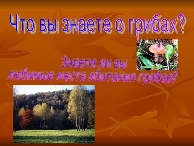 - У каждого гриба есть свои любимые места обитания. Подберёзовики селятся около берёз. Подосиновики любят осинники. В еловых лесах встречаются сыроежки, грузди, среди моховых полянок желтеют шляпки лисичек. Белые грибы растут и около берёз, и около дубов, и около хвойных деревьев. Значит, их можно искать в любом лесу. Грибы вкусны и питательны. Человек всегда употреблял их в пищу. Недаром существуют теплицы, где человек разводит шампиньоны.