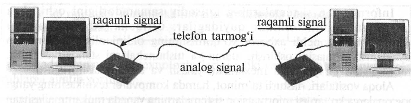 Mintaqaviy va global tarmoqlarda kompyuterlarni alohida aloqa kabellari orqali ulash qimmatga tushadi. Shu sababli ularni modem yordamida telefon tarmoqlari orqali ulash yo'lga qo'yildi. Kompyuterda ma'lumotlar raqamli signallar ko'rinishida saqlanadi, telefon tarmog'i orqali esa analog signallari o'tadi. Kompyuterdan chiqayotgan signallar modem yordamida raqamli ko'rinishdan analog ko'rinishga o'tkaziladi va telefon tarmog'i orqali yuboriladi. Tarmoqning ikkinchi uchidagi kompyuterga ulangan modem analog signallarni raqamli signalga o'tkazadi va kompyuterga uzatadi.