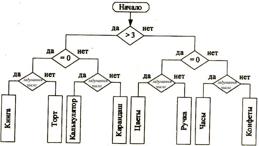 3. Слайд 37. Маша, Юра и Ира задумали следующие числа: 8, 13 и 2. Пользуясь алгоритмом, определите, кто какой подарок получил. Для этого необходимо подставить число, находящееся в его прорези, в написанные ромбиками условия и выбрать путь следования по стрелке «Да» или «Нет».