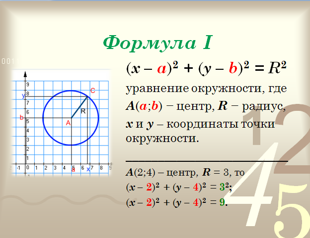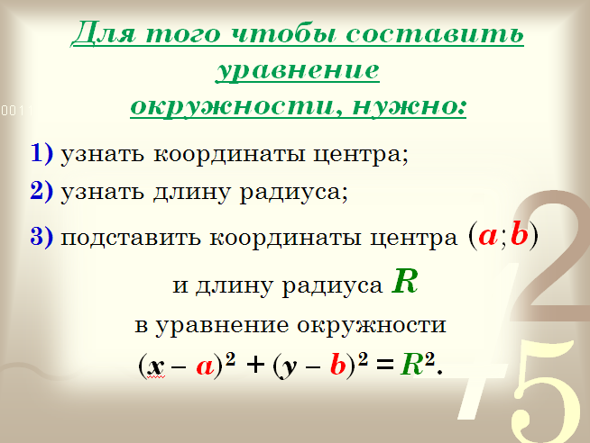 Итак, что надо знать для составления уравнения окружности?