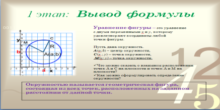 Осуществляется в ходе общеклассной дискуссии по плану, предложенному на слайдах 4 – 7 презентации (Приложение Д.3. – Презентация «Уравнение окружности»). Слайд 4 презентации