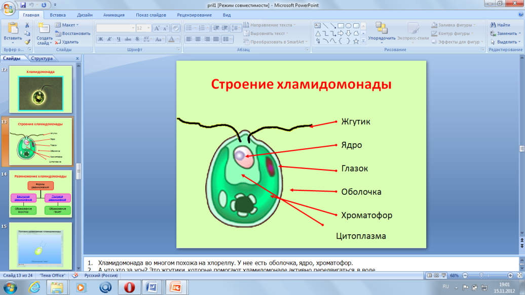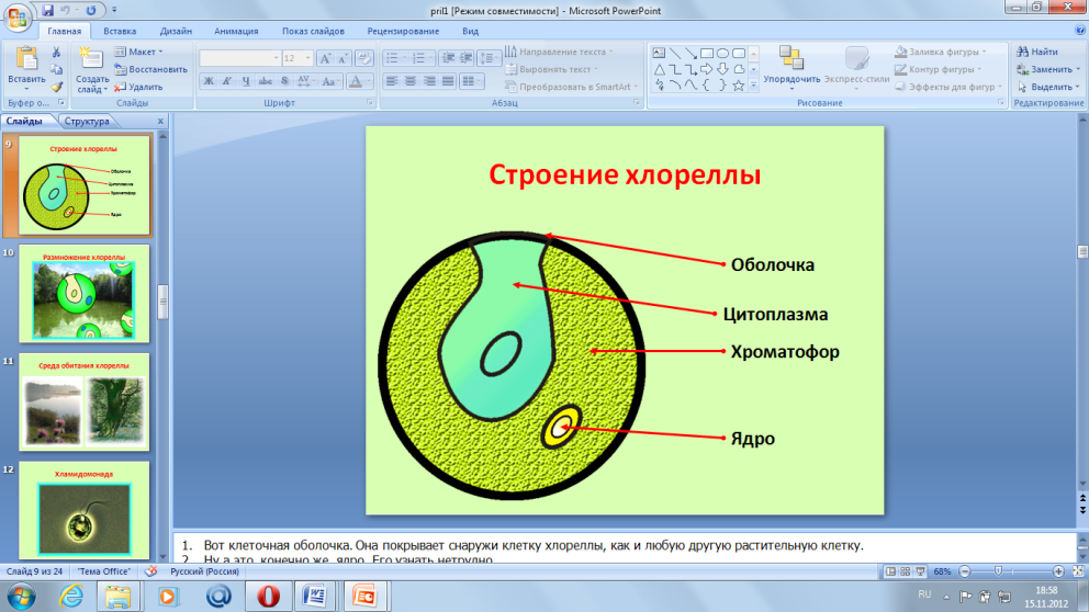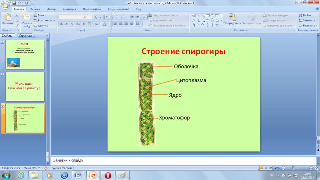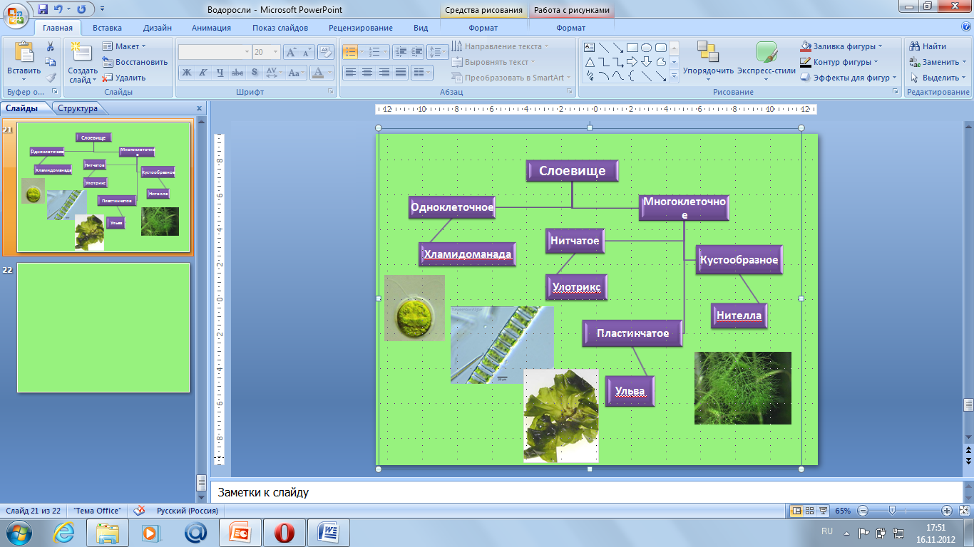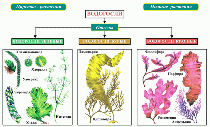 | IV.Первичное усвоение новых знаний | Рассказ учителя (Слайд 8, 9, 10, 11) A) Среды обитания. Основная масса водорослей обитает в водной среде , но встречаются так же водоросли в почве, воздухе, на снегу, на стволах деревьев, в шерсти животных, так же могут образовывать симбиоз с грибами, образуя лишайники. В водной среде они могут входить в состав планктона (фитопланктон), так и произрастать на дне водоемов. (Слайд 12) Итак, подведём итог по пункту "Среда обитания": Б) Строение клетки водорослей. (Слайд 13) Клетки водорослей по плану строения напоминают клетку наземных растений. Сверху покрыты клеточной оболочкой, богатой целлюлозой и пектиновыми веществами. Центр клетки - ядро. Водоросли содержат хлорофилл, содержащийся в хроматофорах различного строения - грушевидного, спиралевидного (спирогира) и т.д. Помимо хлорофилла - зеленого пигмента, в клетках водорослей могут содержаться красные и желтые пигменты. В хроматофоре может находиться пиреноид - тельце с запасными питательными веществами – в основном углеводами. Есть так же вакуоли и цитоплазма  (Слайд 14)  (Слайд 15)  Строение слоевища. (Слайд 16) Тело водорослей представлено талломом и не имеет настоящих тканей, а следовательно и органов – листьев, стебля, корней. Тело некоторых водорослей напоминает тело наземных растений, с листьями и стеблем, но на самом деле это разветвления слоевища.  (Слайд 17) У водорослей, живущих на дне водоемов, тело крепится к субстрату ризоидами или пластинчатым диском. (Слайд 18) Подведём итог по пункту "Строение водорослей" Просмотр фильмов "Спирагира", "Ламинария" (Слайд 19, 20) В) По типу питания водоросли – автотрофы, что это значит? | Углек газ | + Вода | Солнечный свет -→ в хроматофоре | Углевод + | Кислород | Г) Систематика водорослей (Слайд 21) Разделение водорослей на группы в основном совпадает с характером их окраски, что, в свою очередь, связано с набором пигментов, а также основано на общих особенностях строения. При таком подходе выделяется 10 групп водорослей: синезеленые, пирофитовые, золотистые, диатомовые, желто-зеленые, бурые, красные, эвгленовые, зеленые и харовые. но в школьной программе мы изучаем 3 группы: зеленые, бурые, красные.  (Слайд 22) (Работа учащихся в группах "Зеленые водоросли", "Бурые водоросли", "Красные водоросли" по заполнению таблицы в рабочей тетради на стр. 23 №41.) Для помощи учащимся даны ссылки на интернет-источни-ки. (Приложение 1) - А водоросли вредные или полезные? Д) Значение водорослей. (Слайд 23) (Заполнение схемы "Значение водорослей") Источник питательных веществ, для человека и животных, Образователи органики и кислорода в толще воды. Рельефообразователи (известная) Для получения удобрений, БАДов, Индикаторы состояния водоемов. Биотопливо Очистка водоемов. Вызывают цветение водоемов Среда обитания для других животных.  Сообщение "Глютоминовая кислота" | Слушают, смотрят слайды презентации Делают вывод: Водоросли могут обитать в воде, в почве, на снегу на стволах деревьев и образовывать симбиоз с грибами Записывают основные органоиды клеток водорослей Переносят схему к себе в тетрадь. Делают вывод: Водоросли могут быть одноклеточными и многоклеточными. В состав клетки входят: ядро, хроматофор, цитоплазма, оболочка. У некоторых представителей могут присутствовать жгутики и глазок. Просмотр фильмов "Спирагира", "Ламинария", Организмы, которые с