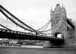 TOWER BRIDGE was opened in 1894. It takes its name from the Tower of London. The hydraulic mechanism can raise and lower the bridge in about one and a half minutes. The covered walkway between the two towers is open to the public and offers a spectacular view of London.