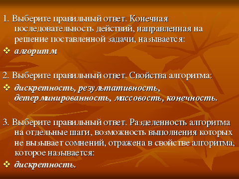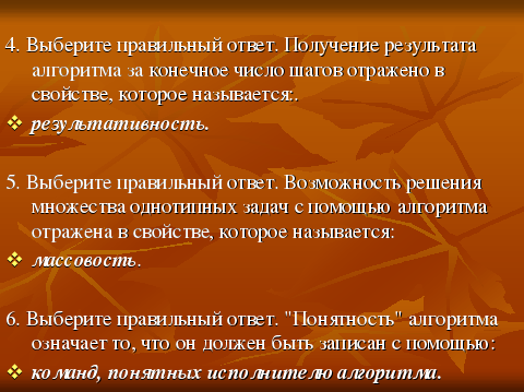 | - В одной из сказок герою в качестве испытания дается задание: «Пойди туда, не знаю куда, принеси то, не знаю, что». Можно ли сказать, что это алгоритм? | | - Нет, это не алгоритм, так как нарушены свойства понятности, определенности и конечности алгоритма |