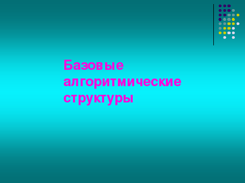 | Итак, мы рассмотрели базовые алгоритмические структуры. Еще раз посмотрите на экран, и назовите каждую алгоритмическую структуру. |  | Линейная. Полное условие. Краткое условие. Цикл с предусловием. Цикл с постусловием. Цикл со счетчиком. |