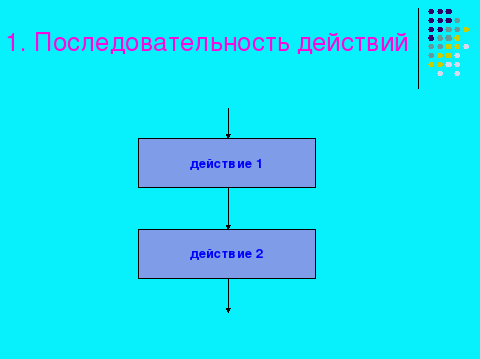 | | - Рассмотрим наиболее часто встречающуюся структуру, которая называется ПОСЛЕДОВАТЕЛЬНОСТЬ ДЕЙСТВИЙ. - Как видно на экране, в этой структуре команды должны выполняться последовательно одна за другой. В этой структуре удобно отслеживать процесс выполнения алгоритма. Обратите внимание на то, что каждая команда (или действие) обозначена прямоугольником. |  | |