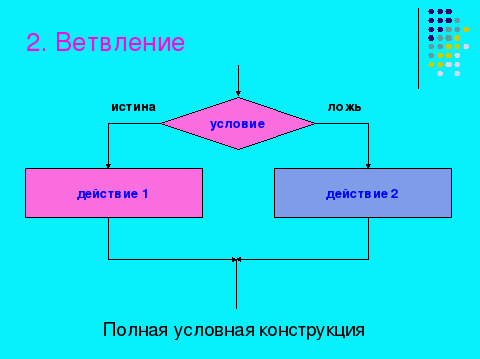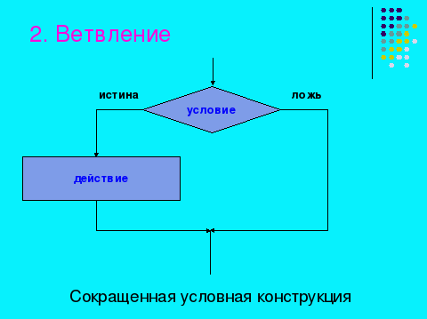 | | | Алгоритмическая структура ВЕТВЛЕНИЕ может быть двух типов: полная условная конструкция и сокращенная условная конструкция. Как видно на этом слайде в сокращенной условной конструкции выполняется только «истинность» условия. ВАЖНО: в условной конструкции алгоритм разветвляется на два пути, в зависимости от некоторого условия, но затем эти ветви сходятся, и выполнение алгоритма опять выходит на общее продолжение. |  | |