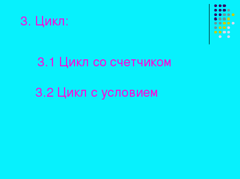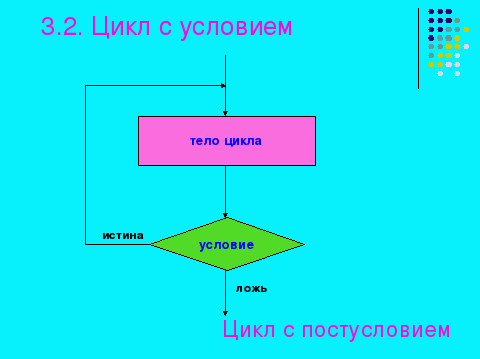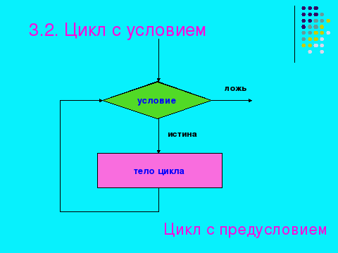 | | | - Часто бывает так, что необходимо повторить тело цикла, но заранее не известно, какое количество раз это надо сделать. В таких случаях количество повторений зависит от некоторого условия. Условие выхода из цикла можно поставить в начале, перед телом цикла. Такой цикл называют ЦИКЛОМ С ПРЕДУСЛОВИЕМ. Помимо этого, условие выхода из цикла можно поставить в конце, после тела цикла. Такой цикл называют ЦИКЛОМ С ПОСТУСЛОВИЕМ. |   | |