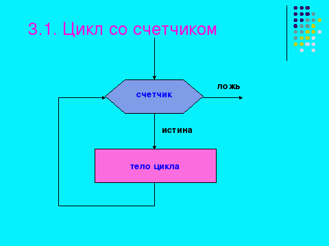 | Следующая алгоритмическая структура ЦИКЛ. В нее входит серия команд, выполняемых многократно. Такая последовательность команд называется телом цикла. Циклические алгоритмические структуры тоже бывают двух видов. На слайде представлен ЦИКЛ СО СЧЕТЧИКОМ. В ЦИКЛЕ СО СЧЕТЧИКОМ заранее известно, какое число повторений тела цикла нужно выполнить. При каждом проходе цикла переменная Счетчик увеличивается на величину шага. |   | |