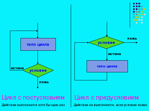 | | | На следующем слайде представлены вместе ЦИКЛ С ПОСТУСЛОВИЕМ и ЦИКЛ С ПРЕДУСЛОВИЕМ. Обратите внимание на их различие. Заметьте, что ЦИКЛ С ПОСТУСЛОВИЕМ в отличие от ЦИКЛА С ПРЕДУСЛОВИЕМ, выполняется обязательно как минимум один раз, независимо от того выполняется условие или нет. |  | |