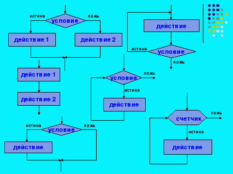 | | - Элементы блок-схем объединяются в базовые алгоритмические структуры. Рассмотрим эти структуры. |  | |