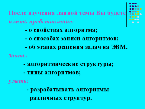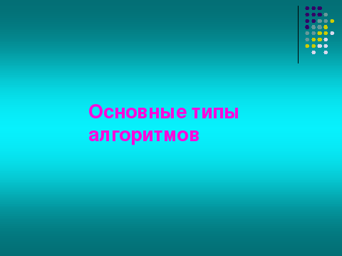 | На базе изученных алгоритмических структур строят алгоритмы, рассмотрим основные типы алгоритмов. |  | |