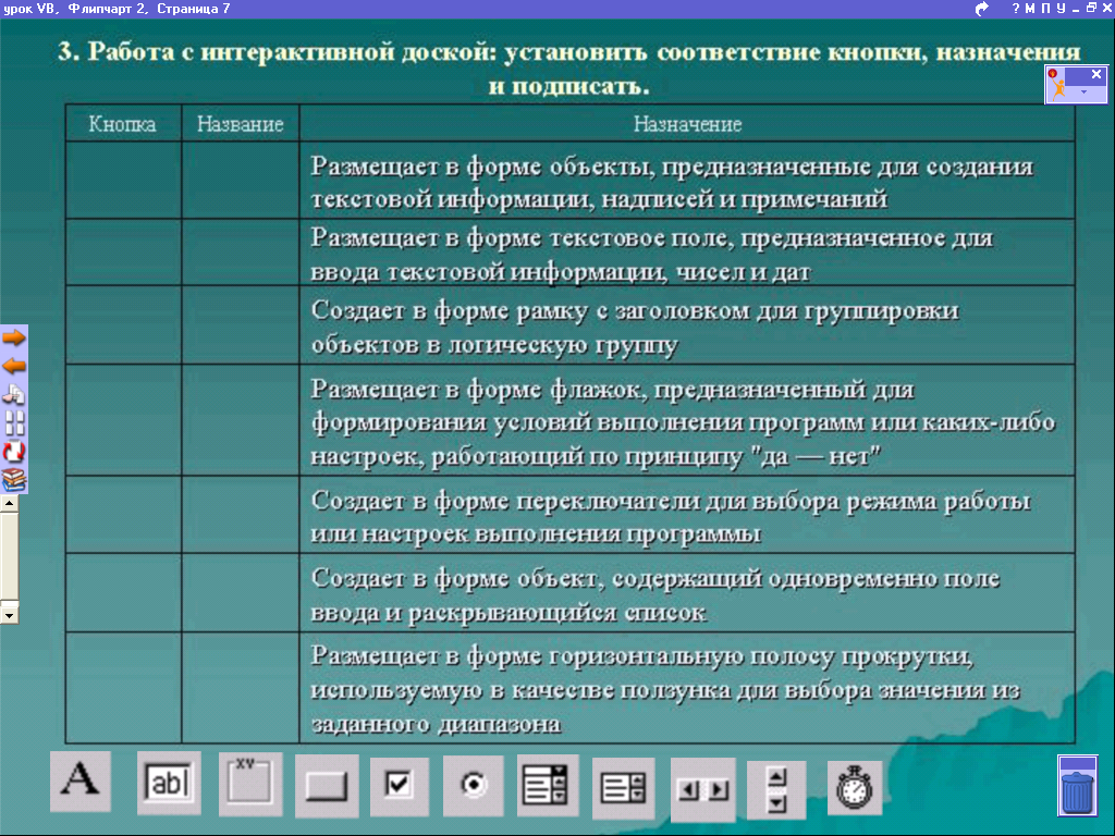 3. Работа с интерактивной доской: установить соответствие кнопки, назначения и подписать.