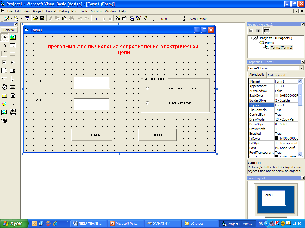 1. Написать программу, которая вычисляет сопротивление элетрической цепи, состояшей из двух резисторов. Резисторы могуть быть соединены последовательно или параллельно. Интерфейс должен иметь такой вид: