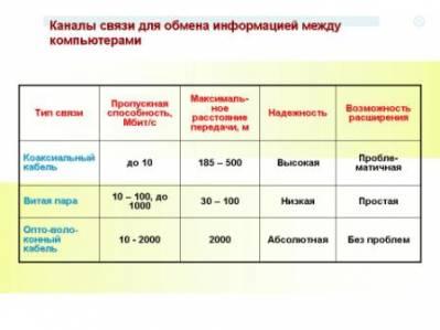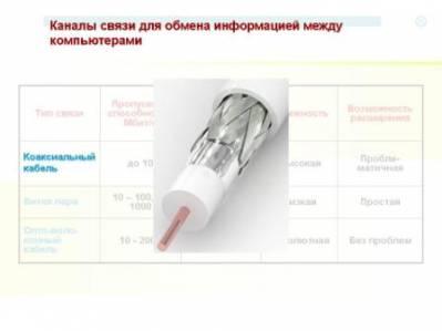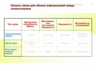 каналы связи: коаксиальный, на витой паре, оптоволоконный, по радиоканалам, в инфракрасном диапазоне;