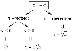 необходимо применить понятие корня n-ой степени. При этом, предложить учащимся самостоятельно рассмотреть все случаи, которые могут возникнуть при решении таких уравнений.