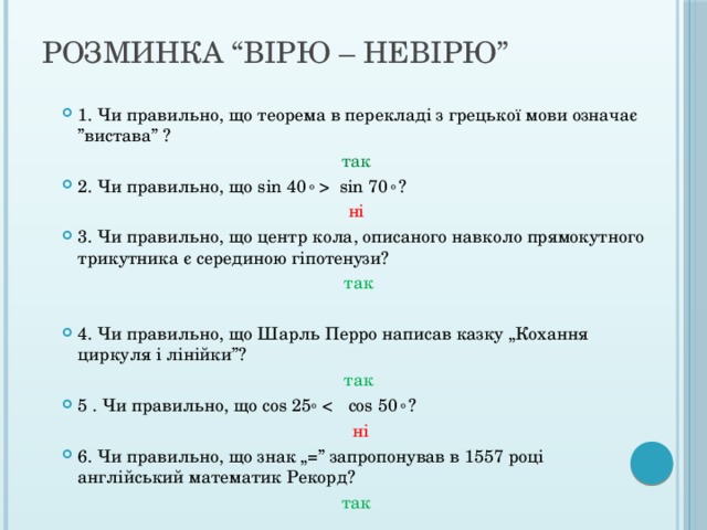 sin 70 о ? ні 3. Чи правильно, що центр кола, описаного навколо прямокутного трикутника є серединою гіпотенузи? так 4. Чи правильно, що Шарль Перро написав казку „Кохання циркуля і лінійки”? так 5 . Чи правильно, що cos 25 о ні 6. Чи правильно, що знак „=” запропонував в 1557 році англійський математик Рекорд? так " width="640"