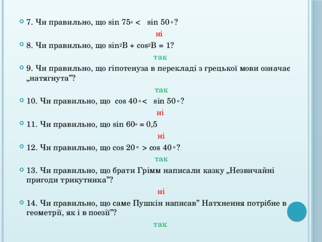 cos 40 о ? так 13. Чи правильно, що брати Грімм написали казку „Незвичайні пригоди трикутника”? ні 14. Чи правильно, що саме Пушкін написав” Натхнення потрібне в геометрії, як і в поезії”? так " width="640"