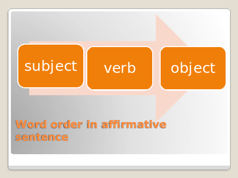 Учащиеся: Утвердительное предложение начинается с подлежащего,далее идет сказуемое,потом дополнение и остальные члены предложения. (The Affirmative sentence begins with the subject, followed by the verb ,object, and all the other members of the sentence.)