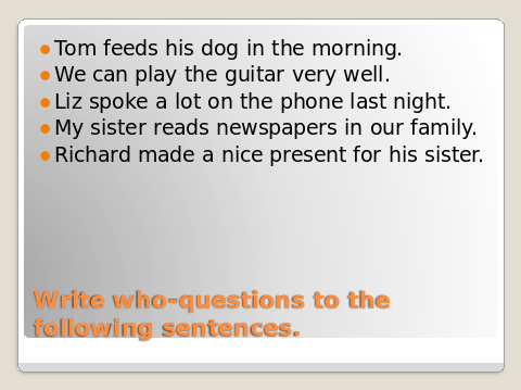 Задайте вопрос к подлежащему(Write who-questions to the following sentences)